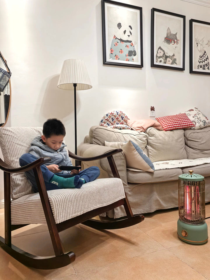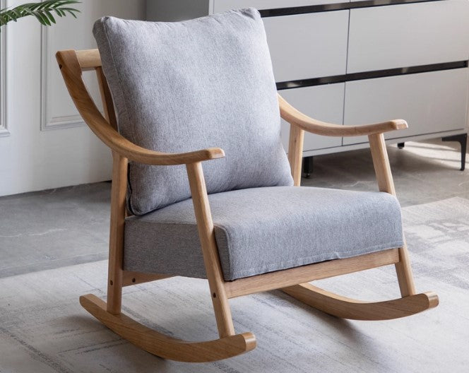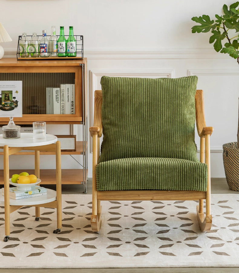 This elegant rocking chair features a sturdy rubber solid wood frame paired with soft corduroy and linen fabrics in sophisticated color combinations like natural or walnut frame with dark green or beige cushions. Its timeless design enhances any living space, offering both comfort and style for relaxing moments at home.