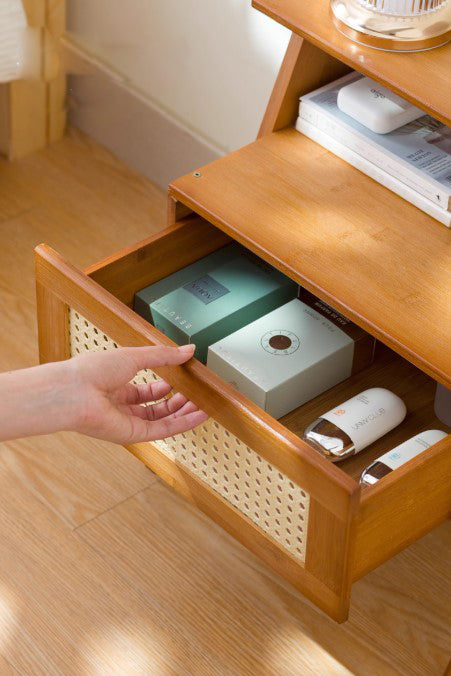 Made from bamboo and PU rattan, this flexible piece works as both a side cabinet and bedside table. Its natural materials add warmth to any space while offering sturdy, reliable storage. Ideal for keeping essentials nearby or displaying your favorite items, it brings practical style to bedrooms, living rooms, or entryways.